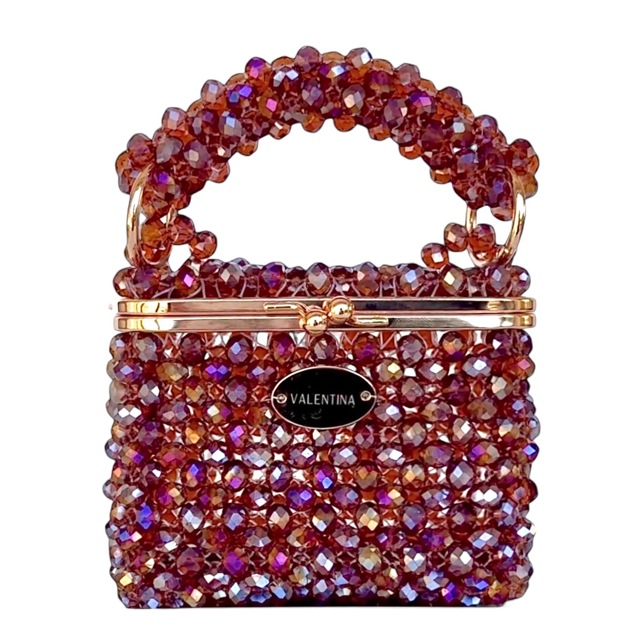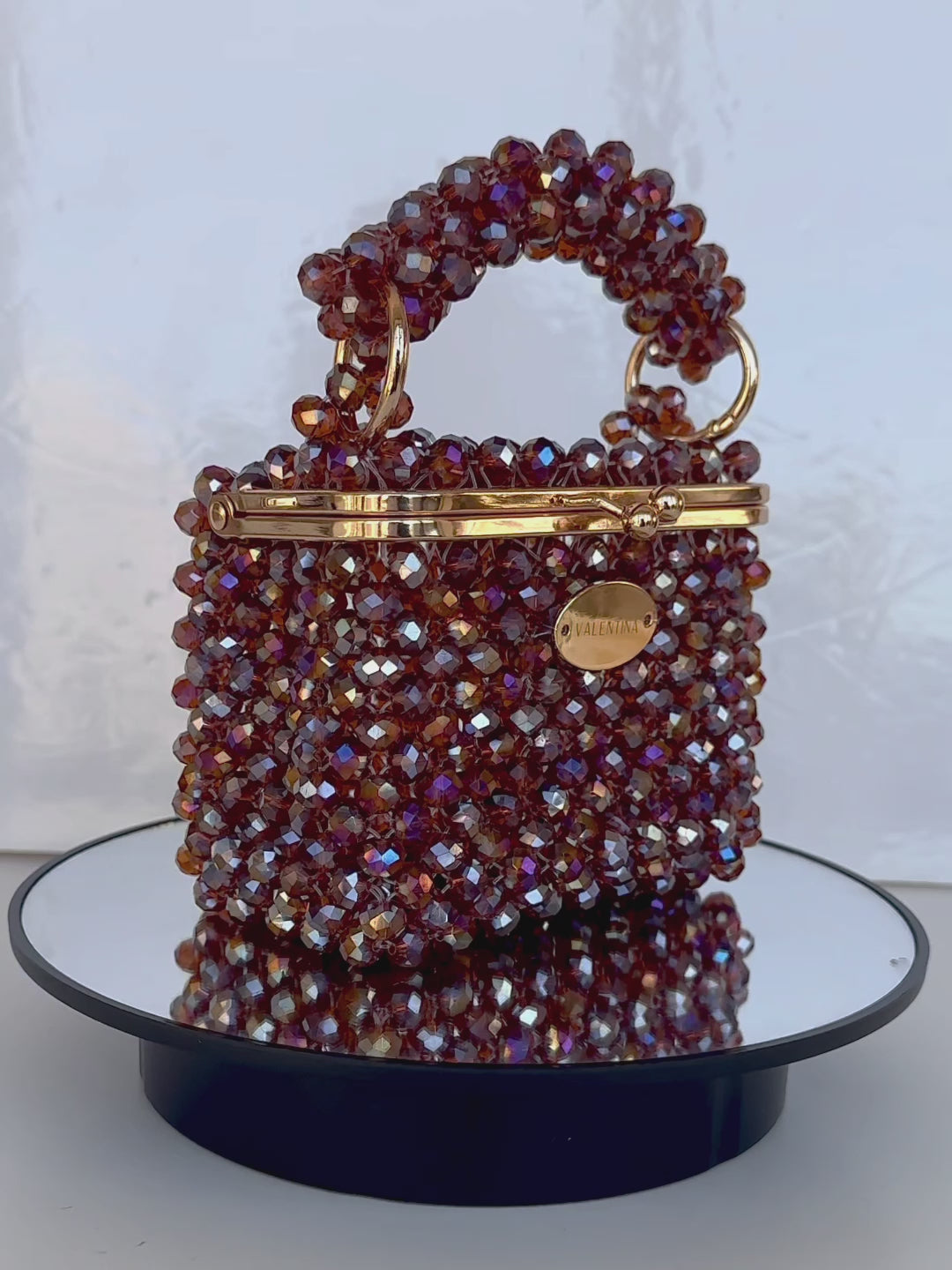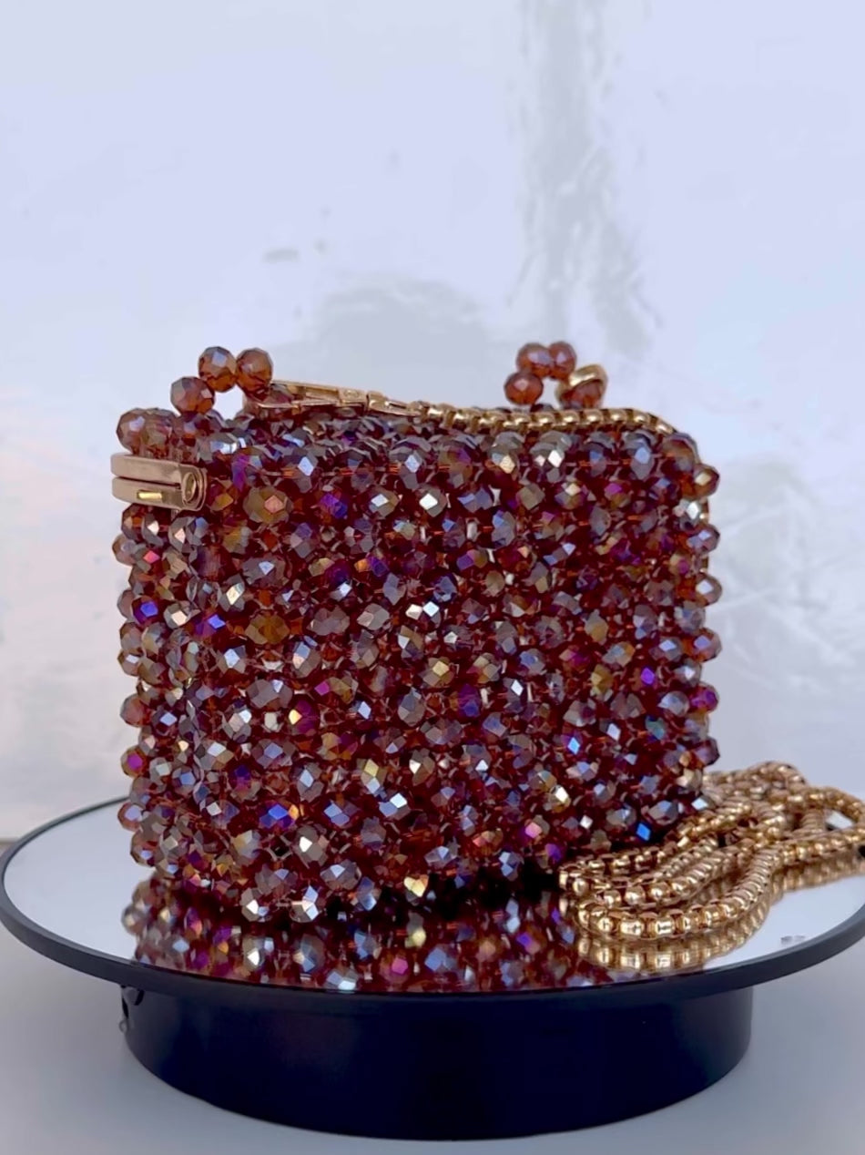 Discover Élégance, our new brown crystal beaded bag with multicolored reflections. Wear it with a handle or chain for a touch of elegance. Perfect for a night out or event, this unique and timeless bag adds a chic and original flair to any outfit.