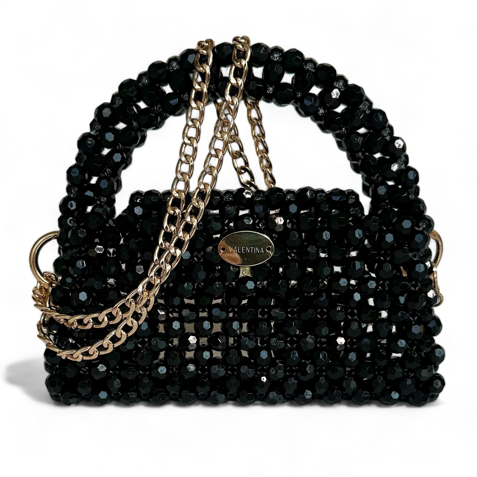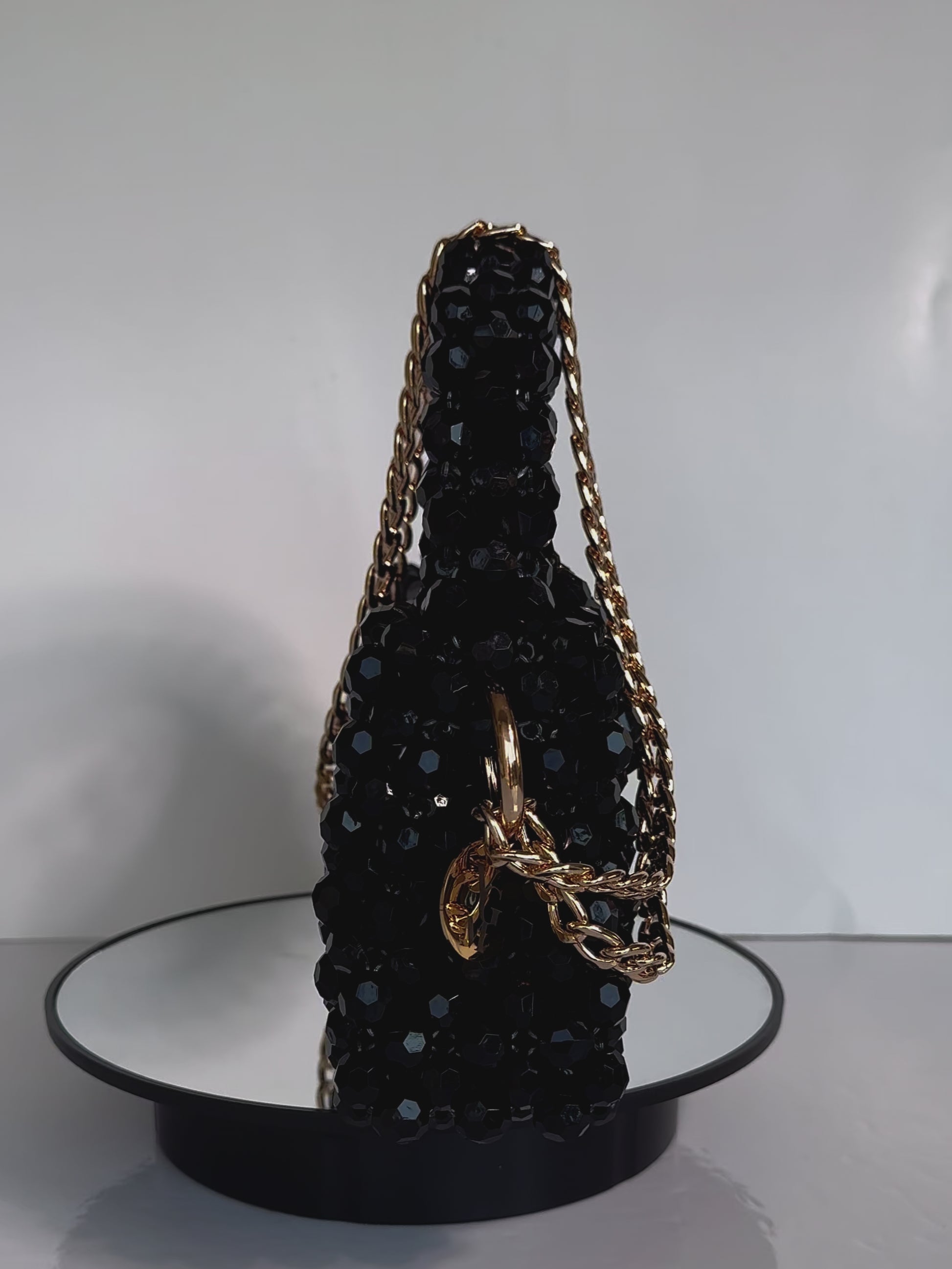 Explore our new black beaded handbag with multifaceted beads, featuring both a beaded handle and chain, offering two stylish ways to carry it. Adorned with a golden charm, its perfect size allows you to store all your essentials. Chic and timeless, black remains a staple.