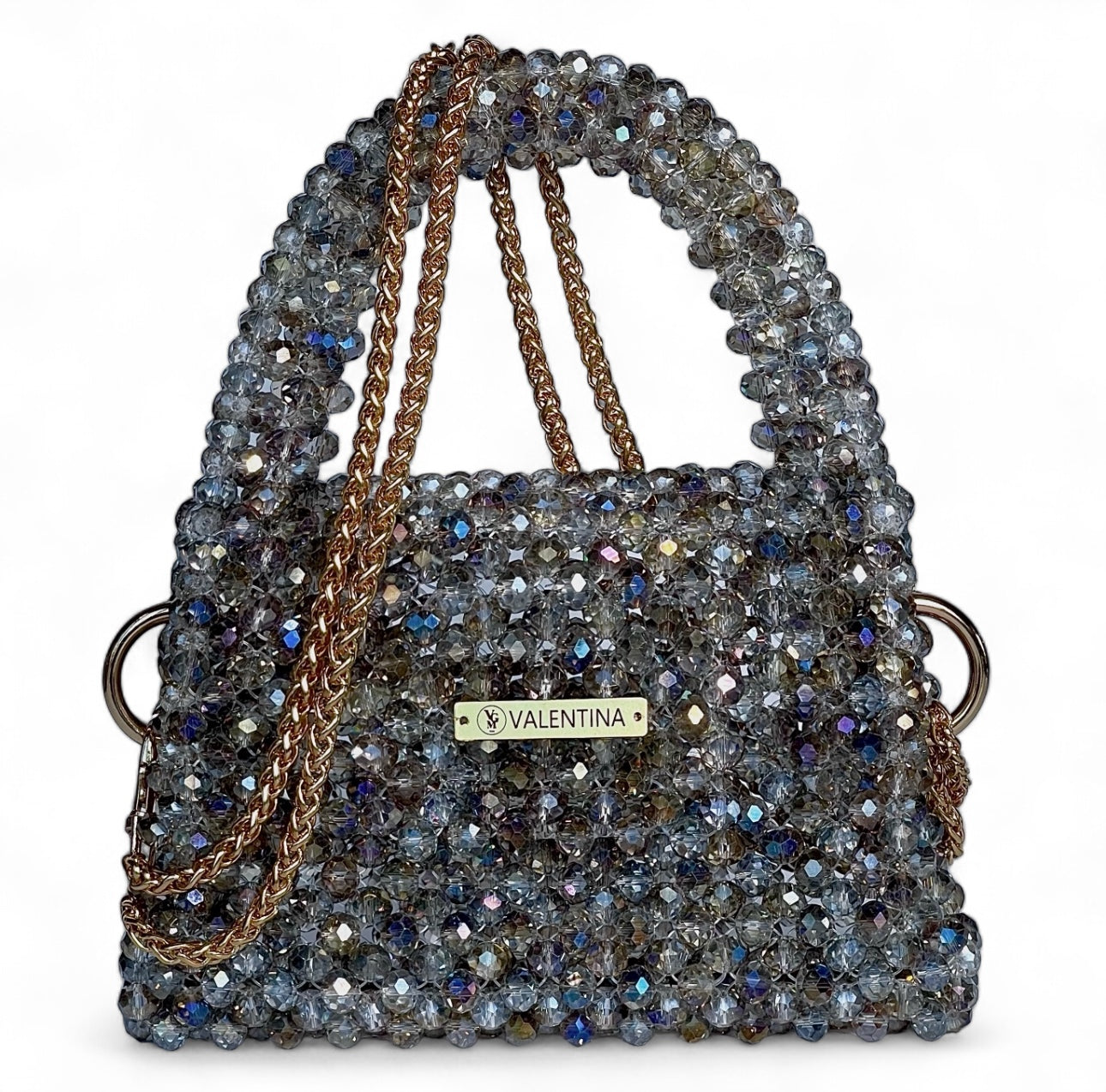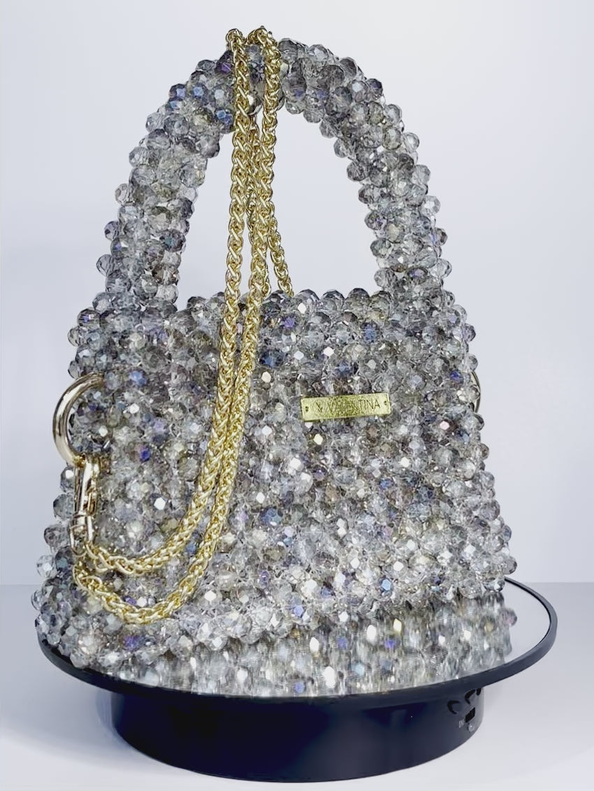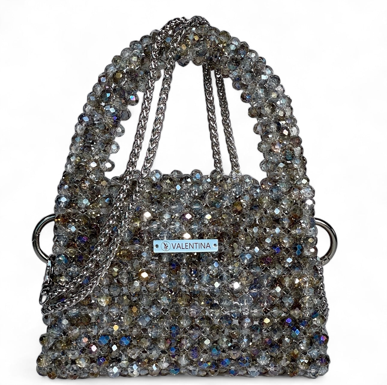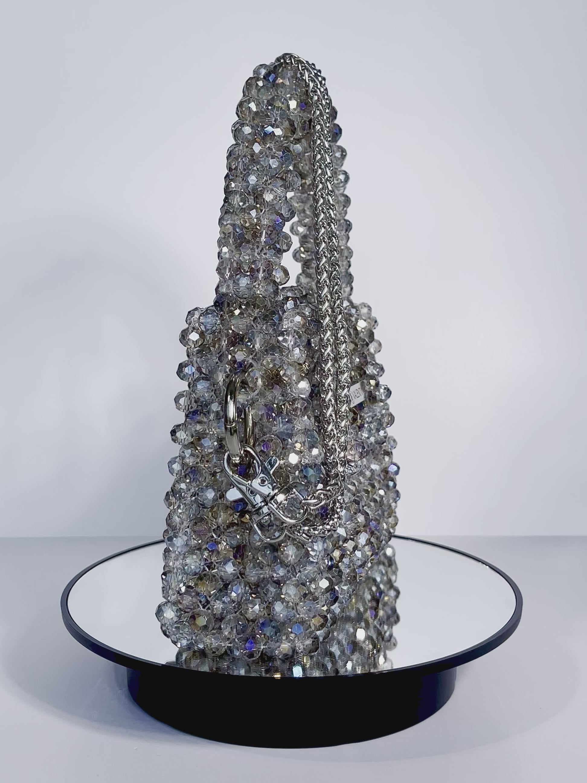 Le sac à main en billes de cristal couleur argent multiface est un accessoire scintillant et chic. Chaque facette reflète la lumière de manière différente et éblouissante, mettant en valeur sa beauté incomparable. Fabriqué avec de véritables billes de cristal, ce sac est incroyablement original et parfait pour tous vos tenues.